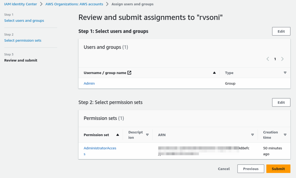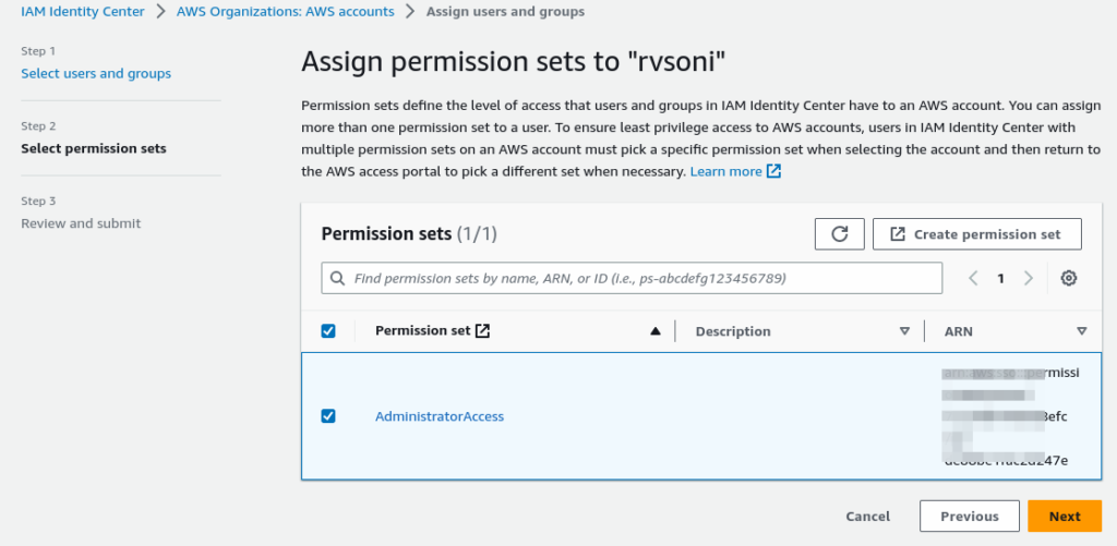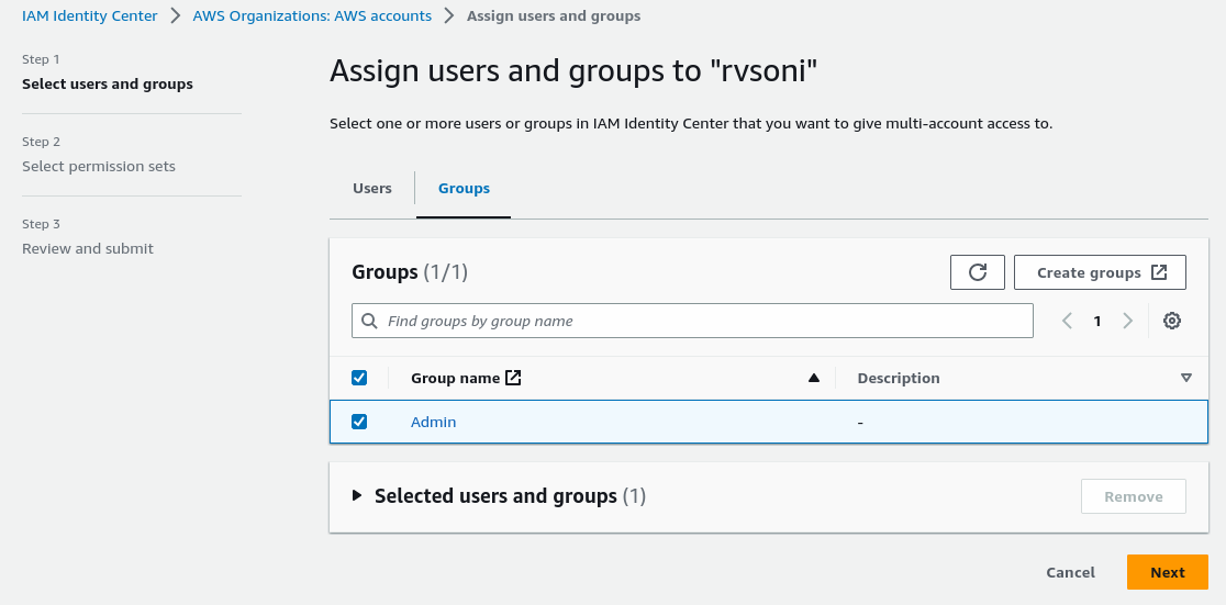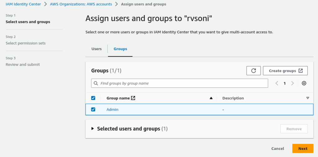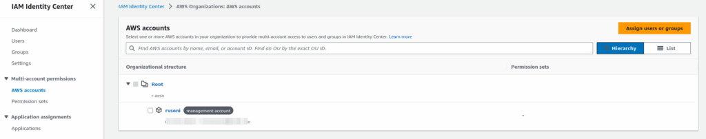 Now it’s time to associate Account with permission set and group. For this select Account from AWS Organization