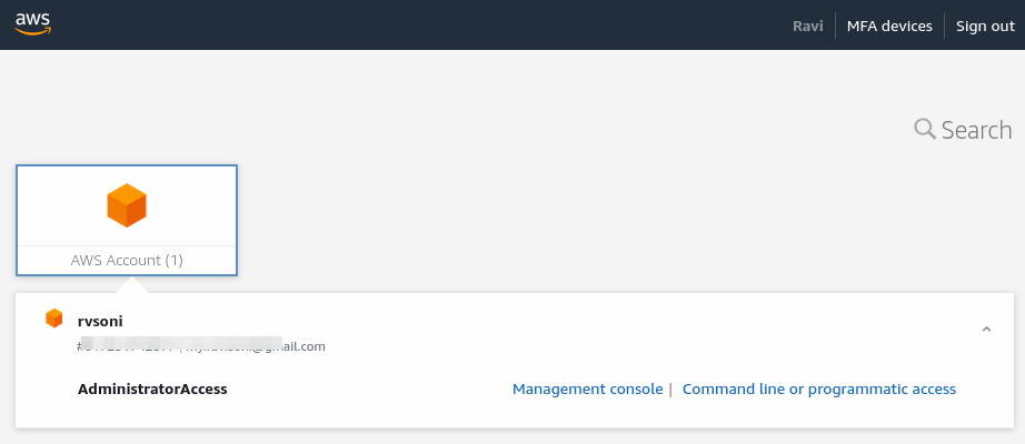 Once login into AWS Portal, you can select AWS Account and log in by assuming Admin Role or can get a Setting for AWS Cli configuration to use AWS Cli (V2) using AWS SSO.